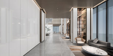 售樓處功能區(qū)分散在整個(gè)空間中,形成流暢清晰的循環(huán),平衡了隱性和顯性之間的關(guān)系,在布局中也融入了未知和交互,以留出更多的想象空間。未知刺激下的人與靜態(tài)物品的互動(dòng),可以為空間注入活力。整個(gè)空間營(yíng)造 出簡(jiǎn)約的空間基調(diào)。帶有紋理的大理石和木制藝術(shù)裝置被引入,以減輕廣闊空間的空虛感??臻g中的物品與自然和藝術(shù)相連。只有在與人互動(dòng)時(shí),他們才能開(kāi)始扮演角色。淺色調(diào)平衡了建筑結(jié)構(gòu)的厚重感,也豐富了空間 的層次感。入口處下沉的燈飾結(jié)構(gòu)打破了空曠感,同時(shí)也豐富了視覺(jué)體驗(yàn)。水吧、休息區(qū)和洽談區(qū)緊密相連,共同形成社交的錨點(diǎn)。整個(gè)售樓處以藝術(shù)美學(xué)和極簡(jiǎn)主義為特色,激發(fā)人們與自然的互動(dòng)。
